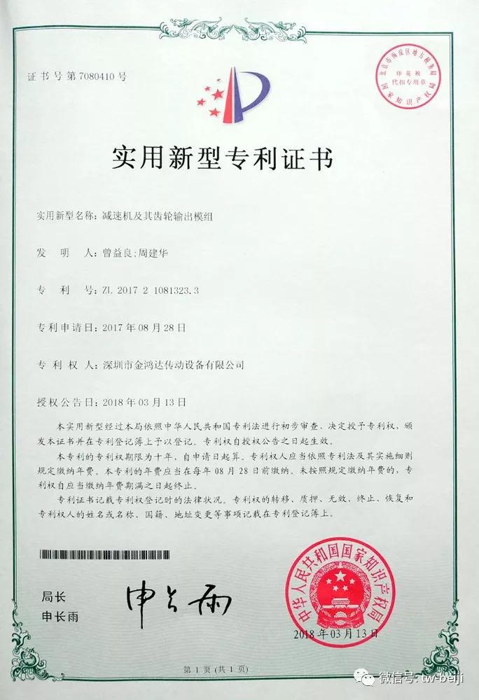 该证书的取得是对我公司这么多年来对减速机技术研发、科技创新、服务理念的肯定和认可。同时也是对企业未来在产品研发、技术创新方面的支持和鼓励。